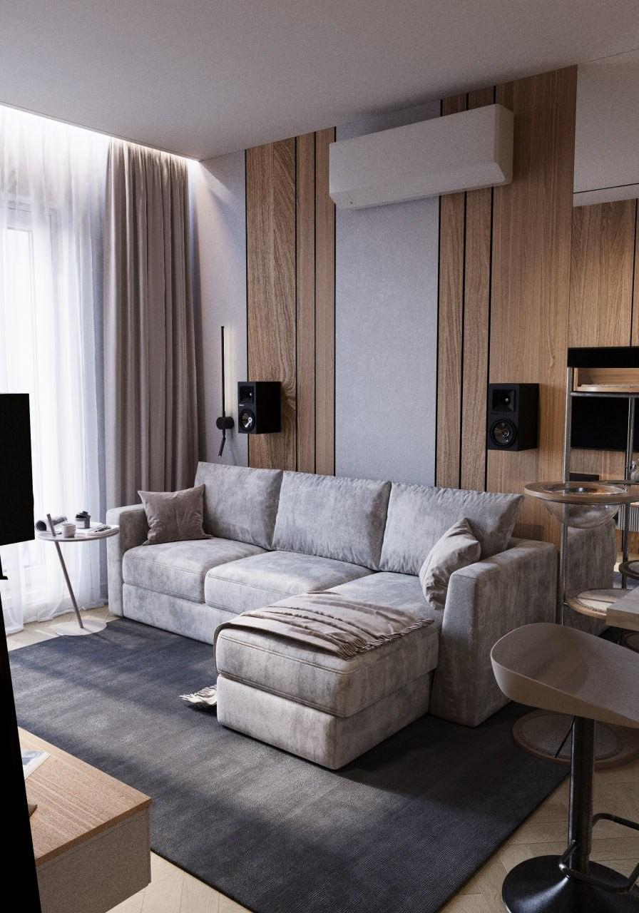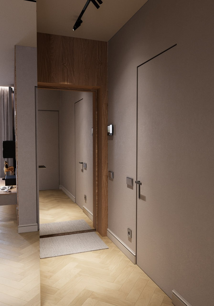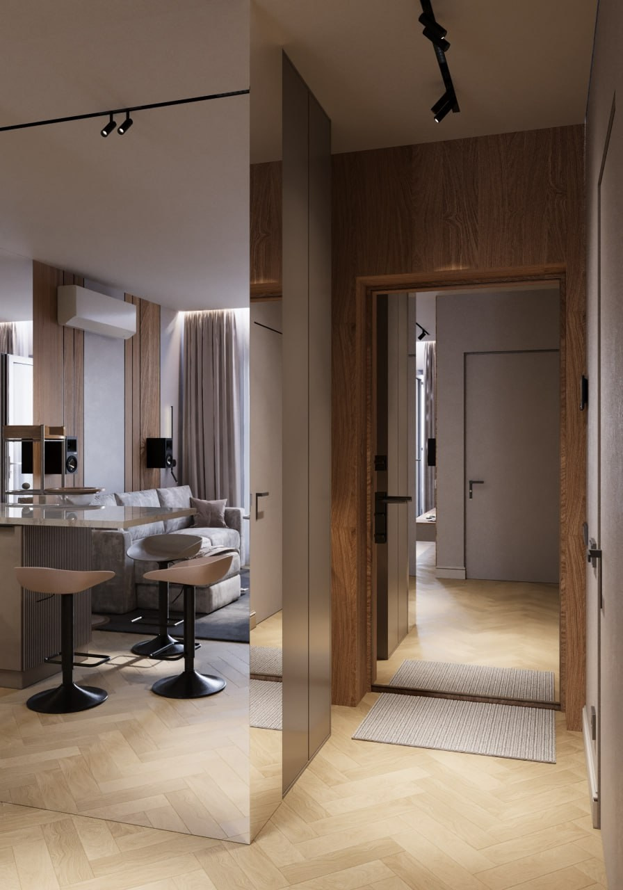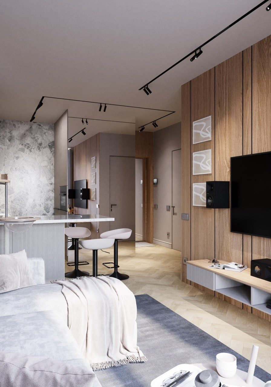 Проект однокомнатной квартиры, г. Евпатории. Этот дизайн-проект выполнен в современном стиле. Минимализма ему придают современные настенные панели, которые скрывают все неровности и делают пространство цельным. Светлые тона, зеркала и стеклянный элементы позволяют наполнить маленькую площадь воздухом и визуально расширить пространство. А натуральное дерево и элементы скалы на стенах наполняют интерьер жизнью и уютом природных элементов. Квартира вышла очень просторной и комфортной для длительного проведения времени.